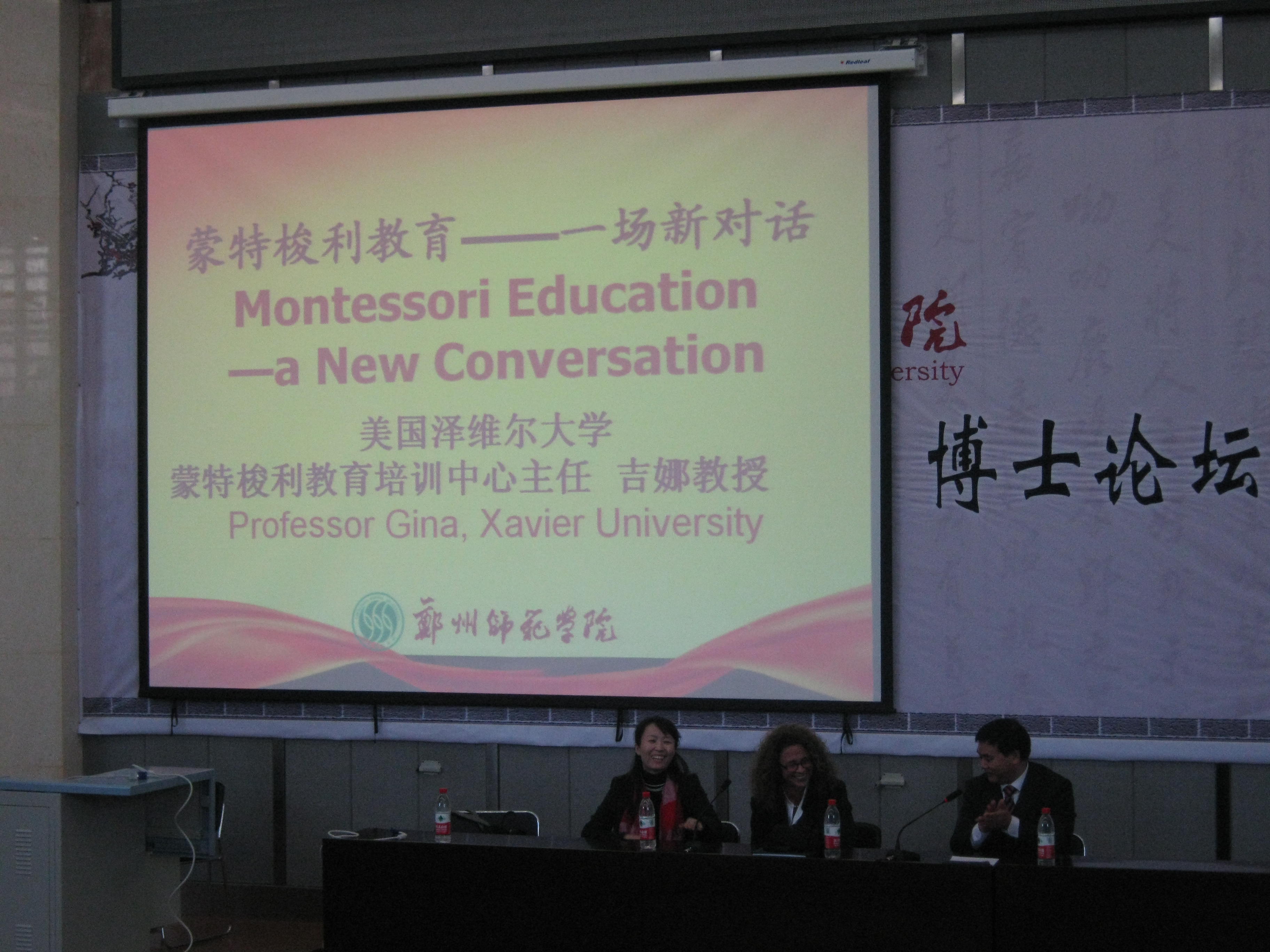 11月13日上午9点,美国泽维尔大学蒙特梭利教育培训中心主任吉娜教授应邀在我校学术报告厅作了题为《蒙特梭利教育——一场新对话》的专题报告。教育科学学院、国际交流与合作处相关负责人及教育科学学院学前教育专业部分师生到场聆听了报告。