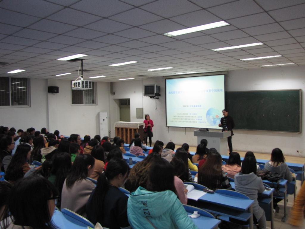 11月4日晚,我国康复教育专家周红省教授以“现代教育康复技术在残疾儿童教育康复中的应用”为主题给特殊教育学院学生做了专题报告。她先后从残疾儿童教育康复工作的背景、做好残疾儿童教育康复需要掌握的现代教育康复技术、残疾儿童教育康复课程设置及案例分享、以及对未来的展望等四个方面进行阐述,还针对我院的特殊情况教给同学们了几个关于言语康复的小技巧。最后,周教授给大家提出了要求:在课堂上好好学习康复方面的知识,课下熟练掌握相关仪器的操作,为以后就业打好基础。