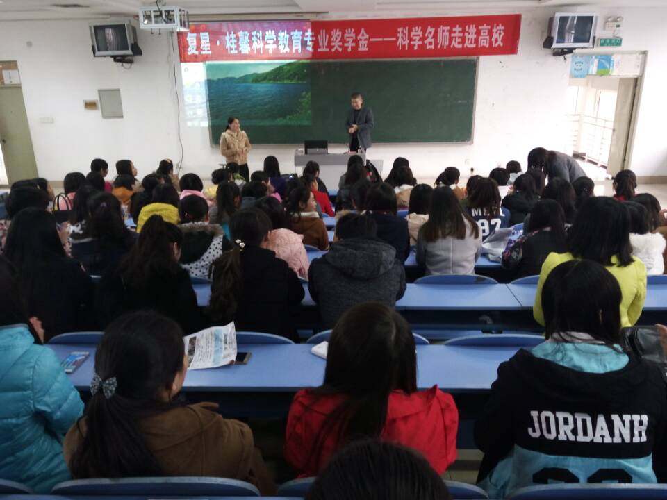 2015年11月7日下午2:30分,桂馨基金会科学老师阮翔来到郑州师范学院化学化工学院为科学教育专业的学生做科学课培训讲座,本次讲座由毛海荣老师主持,化学化工学院科学教育专业14级、15级全体学生参加此次讲座。