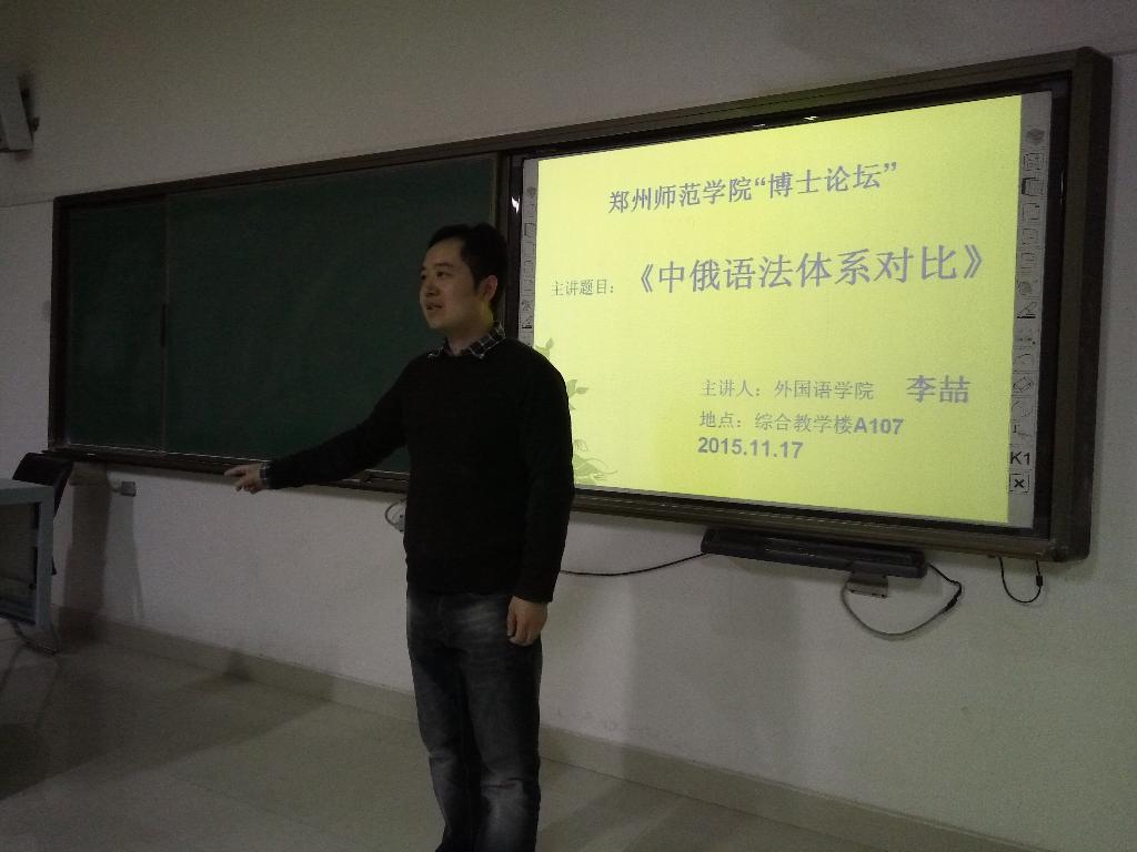 为了使2015级新生更快地熟悉俄语语言特点,从而建立有效的学习方法,外国语学院于2015年11月17日下午16:00-18:00在综合楼A107教室为15级应用俄语专业全体学生举办了《中俄语法体系对比》的讲座,主讲人是外国语学院亚欧语系的李喆博士。此次讲座是外国语学院“博士论坛”系列讲座中的其中一场。