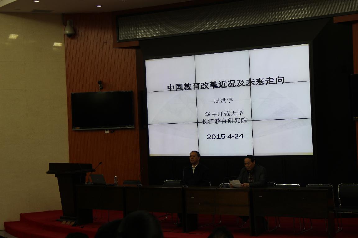 4月24日下午16:50,华中师范大学教授、博士生导师周洪宇先生来我院进行学术讲座与交流。讲座在特教楼5楼会议室进行,教育科学学院全体教师到场聆听。此次的讲座内容主要是关于教育学学科的发展与创新。