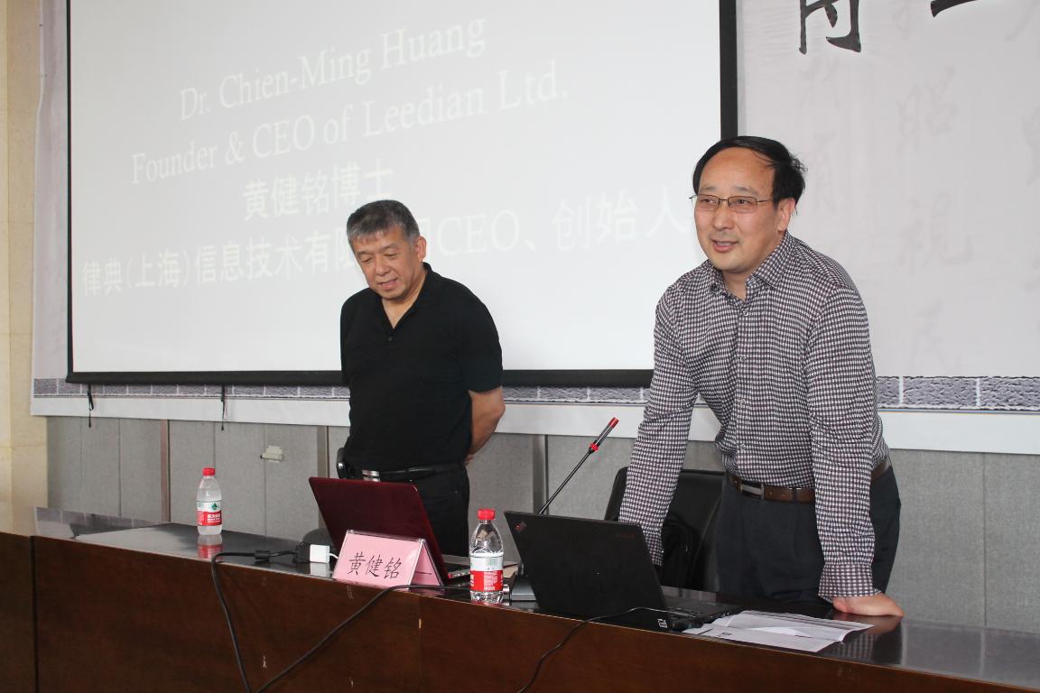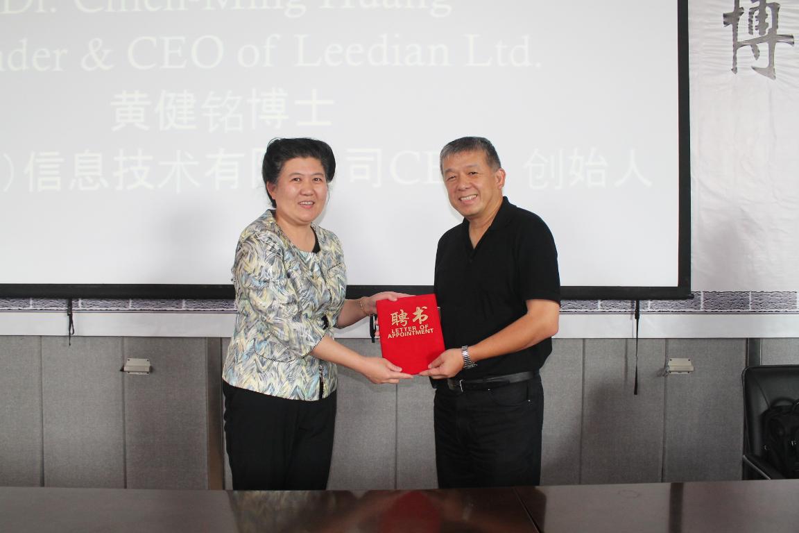 2014年9月22日下午,综合楼A301教室, 律典(上海)信息技术有限公司董事长黄健铭博士为信息工程与技术学院和软件学院师生作了一场“设计的智慧”的学术讲座。副校长蒋丽珠、科研处王永恒处长出席了本次交流会。副校长蒋丽珠向黄健铭博士颁发了郑州师范学院客座教授的聘书。