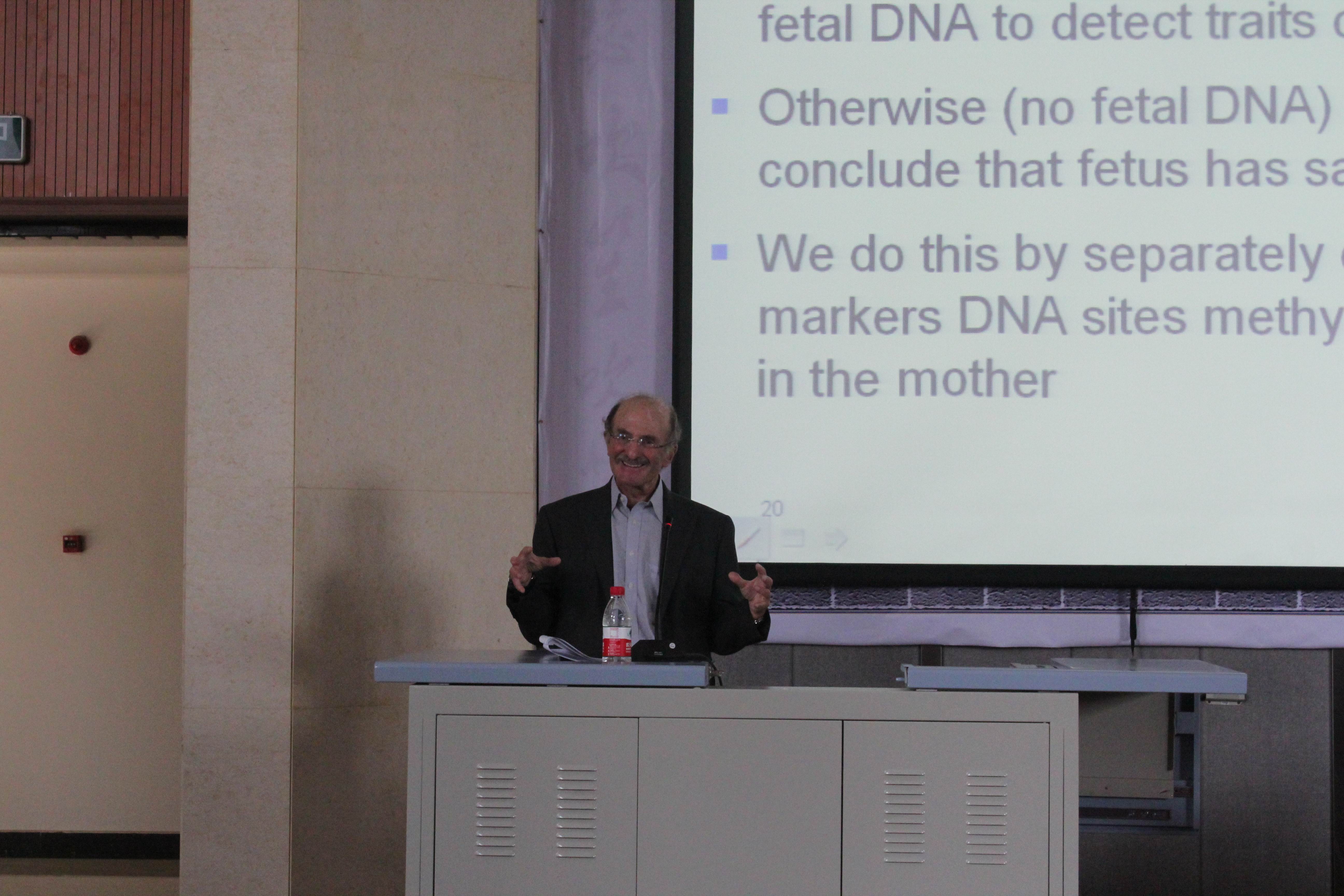 为加强我校与世界有关学术组织的联系与合作,王北生教授首先向Charles Cantor院士颁发郑州师范学院兼职教授证书。Cantor教授分别从“老年黄斑变性”、“非损伤性产前诊断”以及“肿瘤研究”等三个方面讲述核酸质谱及第二代测序技术在临床DNA分析中的作用,概括论述人类基因基因组测序完成十年来的功用。期间,Cantor教授被同学们的热情所打动。师生们在有幸感受世界顶级科学家风采的同时,还了解到生命科学的最新研究技术及应用进展。